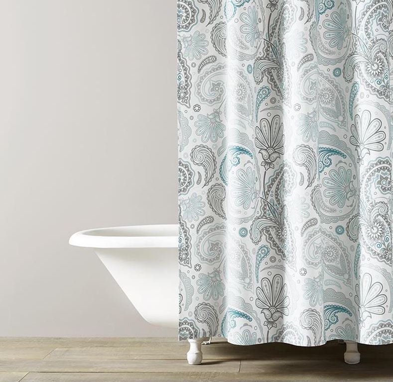 A Modern Paisley pattern in teals, blues and grey adorn this 100% Cotton Shower Curtain by Kassatex.